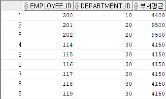 부서평균 열을 보게되면 partition by department_id 쿼리 문으로 인해 부서 전체의 평균이 구해진것을 알수있다.