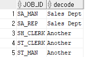 decode(job_id, 'SA_MAN','Sales Dept','SA_REP','Sales Dept','Another') as "DECODE"