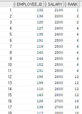 SELECT employee_id, salary, RANK() OVER(ORDER BY SALARY) "RANK" FROM employees;