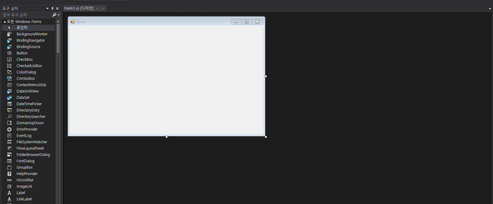 완료후엔 이러한 창이 뜰텐데 왼쪽에 도구상자에서 "Button" 을 찾아서 창에 드래그로 갖다 붙인다.