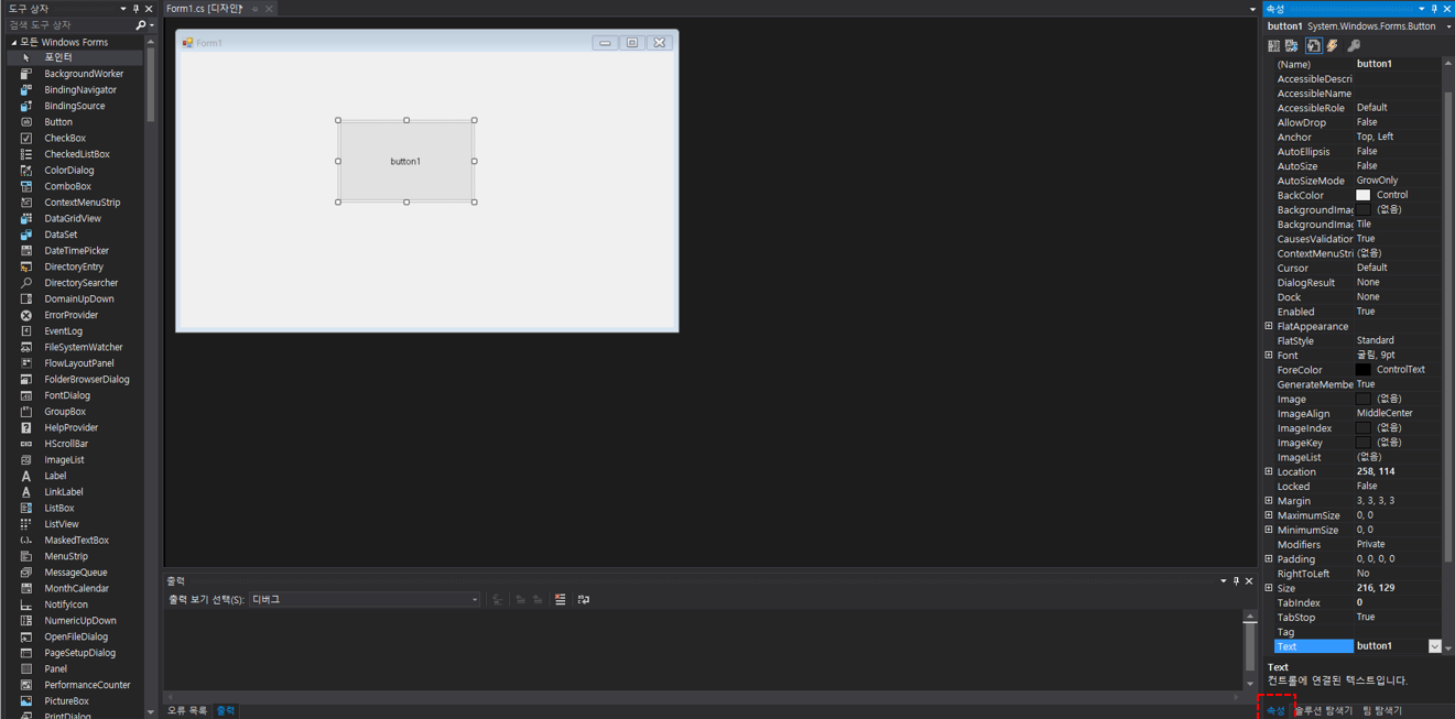 속성탭에서는 각종 Control 의 속성을 변경할수있다. button1 을 -> 버튼 으로 변경하고 싶으면