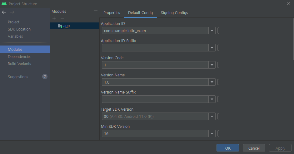 3. Modules > Default Config > Target SDK Version = 30 으로 설정