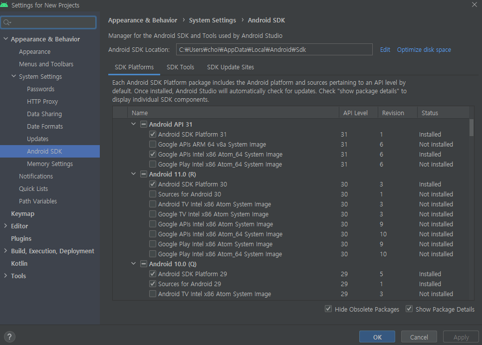 우측 하단 Show Package Details 클릭후 해당되는 패키지 설치 하면 된다.