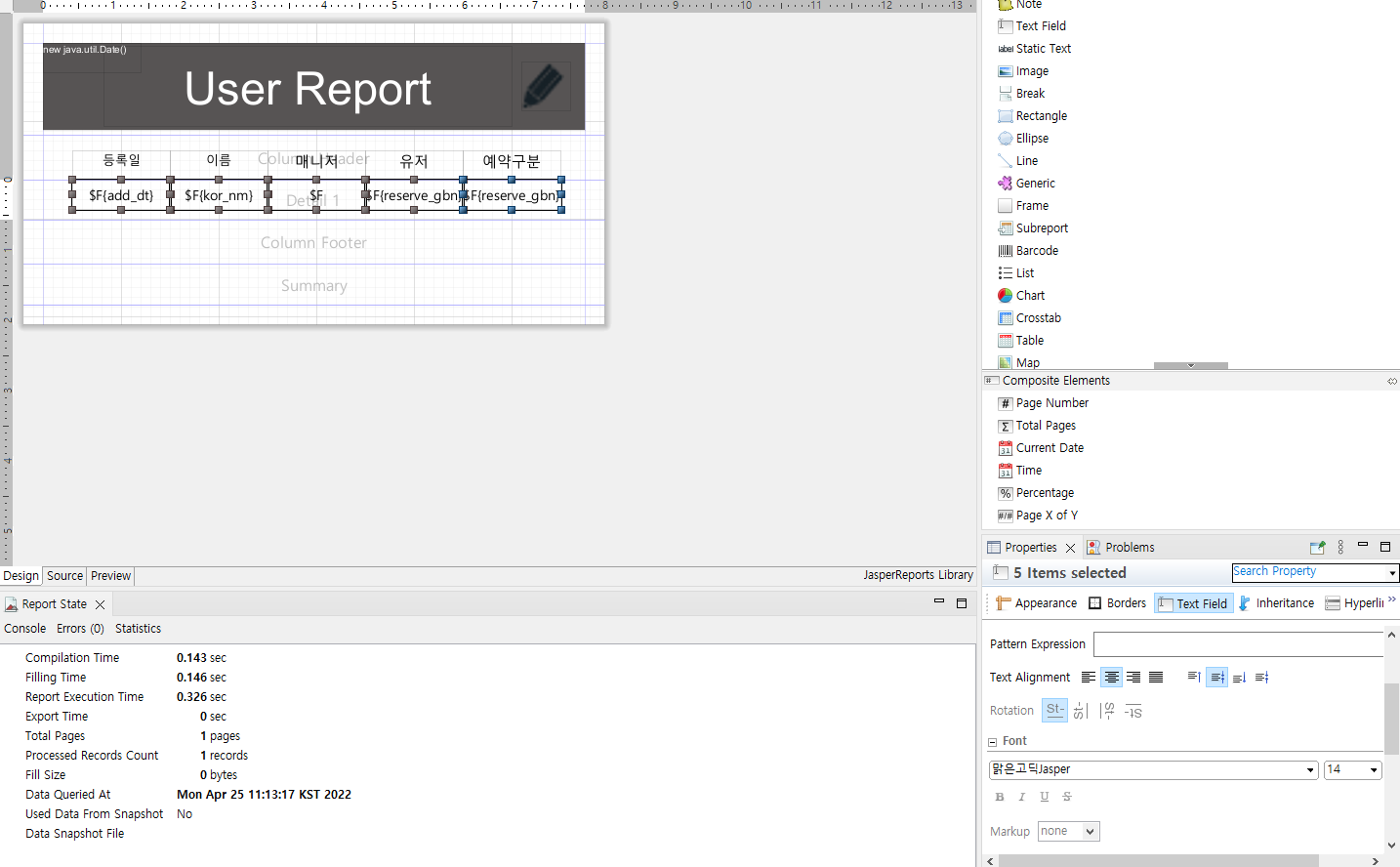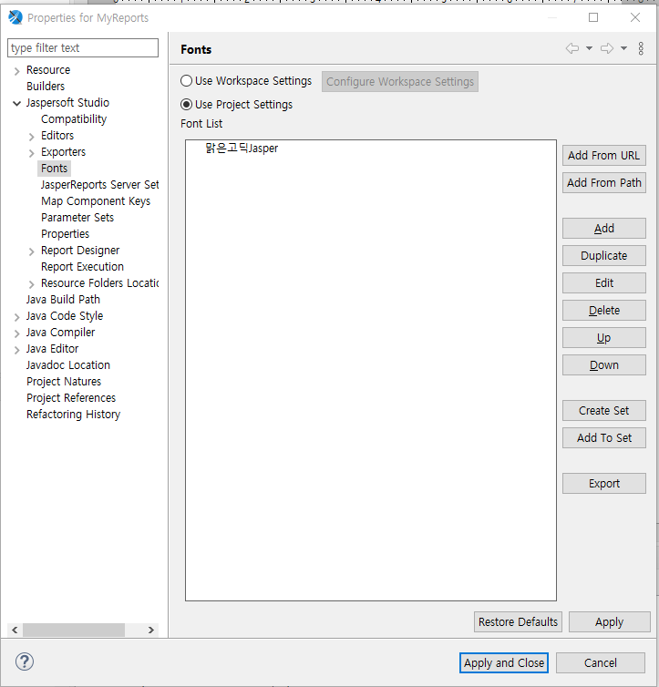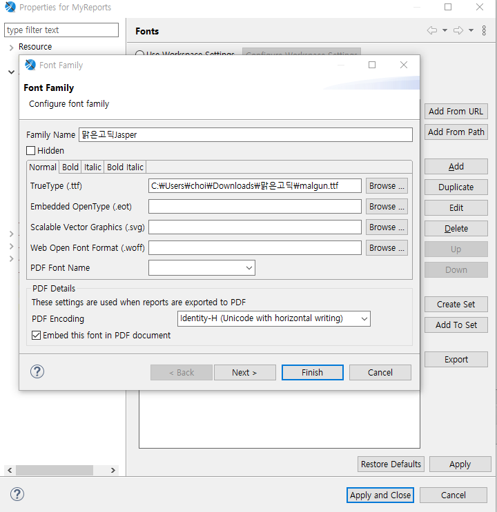 이따위 오류가 나온다. 개발 OS 에 폰트 설치하면 JasperStudio 에서는 적용이 된다.