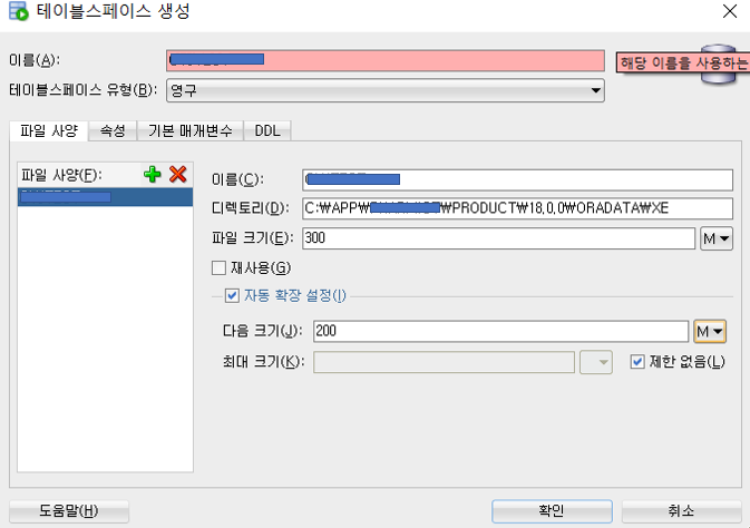 ※ 디렉토리는 기존 생성되어 있는 테이블스페이스를 우클릭하여 편집을 누르면 해당 상세정보를 볼수 있는데